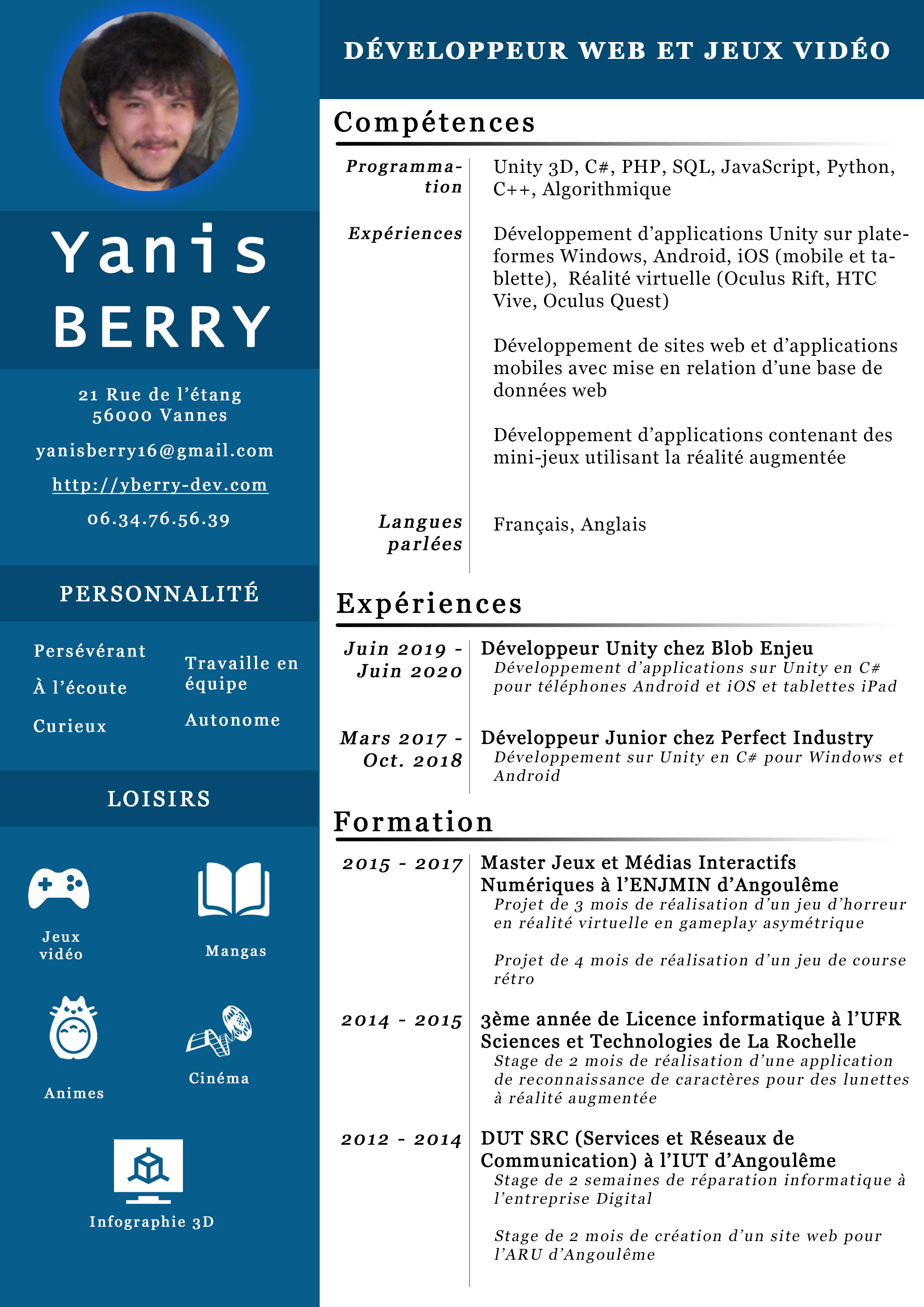 Je suis Yanis BERRY, j'ai 26 ans et je suis actuellement à la recherche d'un emploi dans la programmation, de préférence à Vannes, en Bretagne. Je suis avant tout un passionné de programmation web et logicielle (HTML, CSS, JavaScript, PHP, SQL, C#, C++, Java, Python), surtout en ce qui concerne les jeux vidéo (Unity 3D, Unreal Engine 4), mais je me laisse aussi vaquer à d'autres occupations comme le motion-design et l'animation 3D. Sur ce site vous pouvez découvrir mes différentes créations, tant bien au niveau jeux vidéo, applications web, qu'animations 3D, et télécharger mon CV. Si vous souhaitez me laisser un message, allez en bas de page.